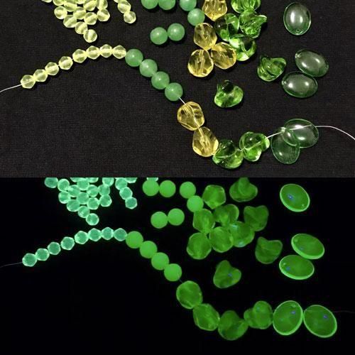 暗闇でブラックライトを当てると蛍光に光るウランガラスで作れらています。