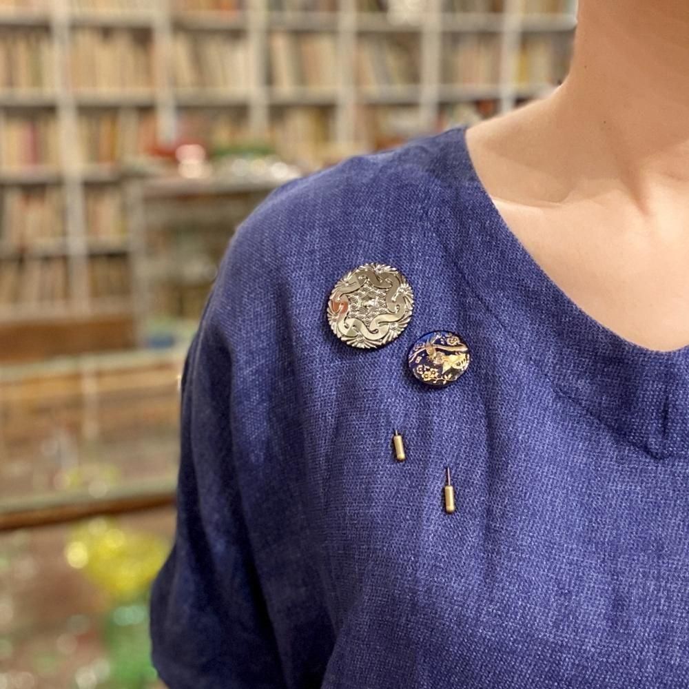 私は穴部分にハットピン金具を通し、ピアスの樹脂キャッチで押さえて、ブローチのようにしてこのボタンをよく着けています。