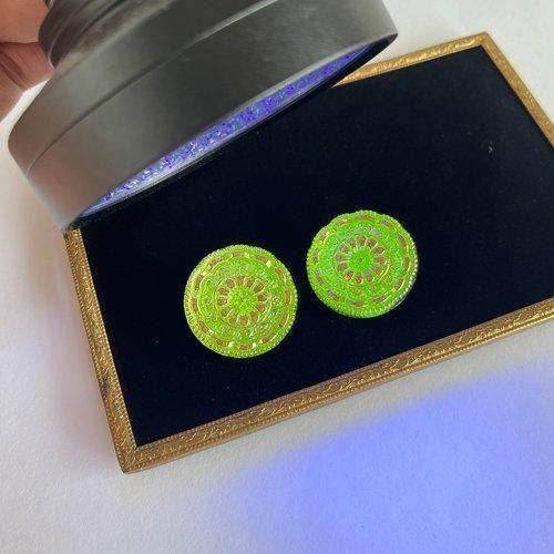ブラックライト(強い紫外線)を当てると蛍光に光るウランガラスで作れらています。