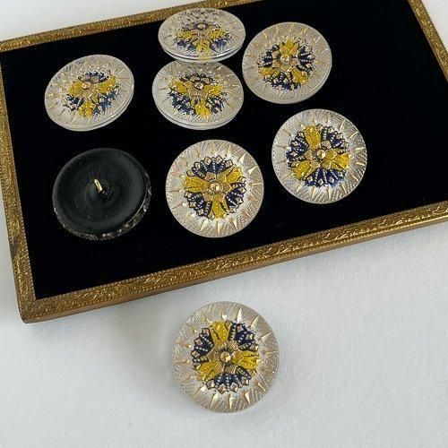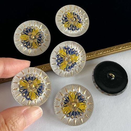 チェコのガラスボタン 27mm 中央に花 白紺黄ペイント