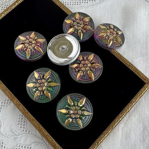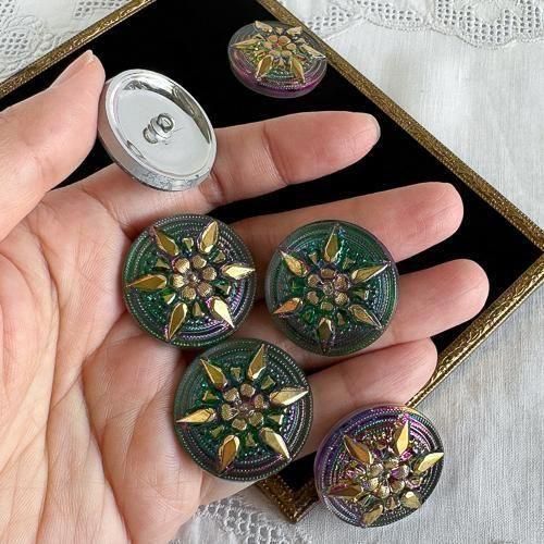 チェコのガラスボタン 27mm ヴィトラルグリーン ゴールド花