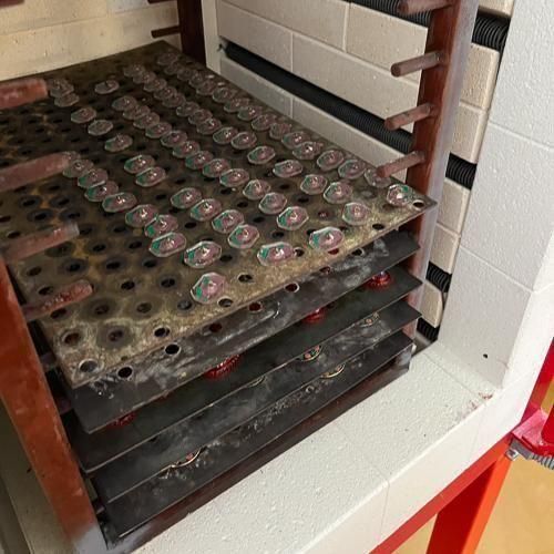 炉で溶かしたガラス棒を金属の型で挟み形を作り、縁を研磨し、ハンドペイントで色付けをし焼成をして作られています。