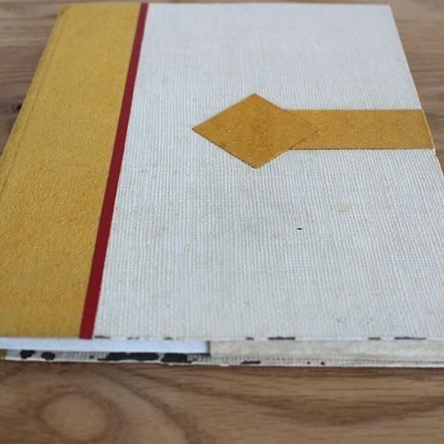 ケースは厚紙に凹凸のある紙を貼り付け、更に表面がもさもさした黄色の紙と赤いテープでデザインされています。