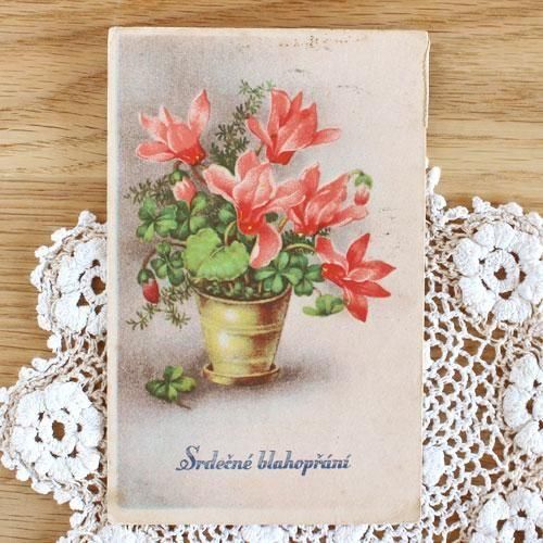 チェコ1940-50年代のポストカード 鉢植えの花とクローバー