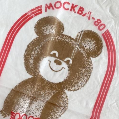 1980年にモスクワで開催されたオリンピックのマスコットキャラクター、こぐまのミーシャのイラストがプリントされたビニール袋です。