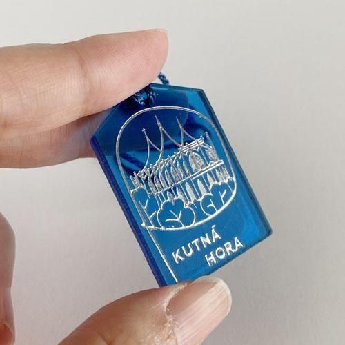 プラスチック製ですが、透明な青色にシルバーの型押しのようなプリントで、バッグチャームのように使っても可愛いと思います。