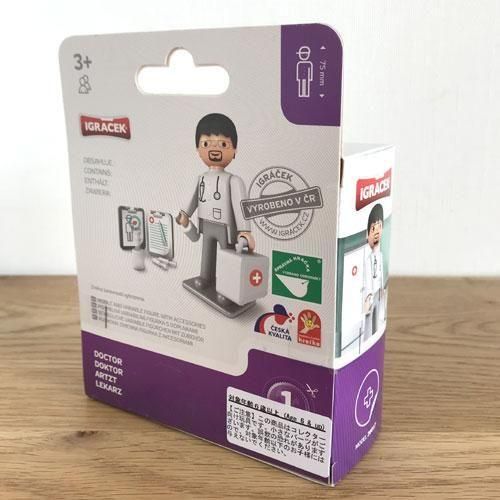お医者さんの男の子とカバン、注射器、ボトルなどがセットになっています。カルテは紙製です。