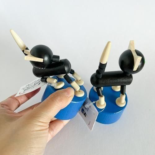 底を押すとモチーフがぐにゃりと倒れる木製プッシュトイです。