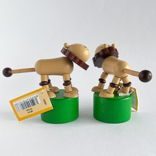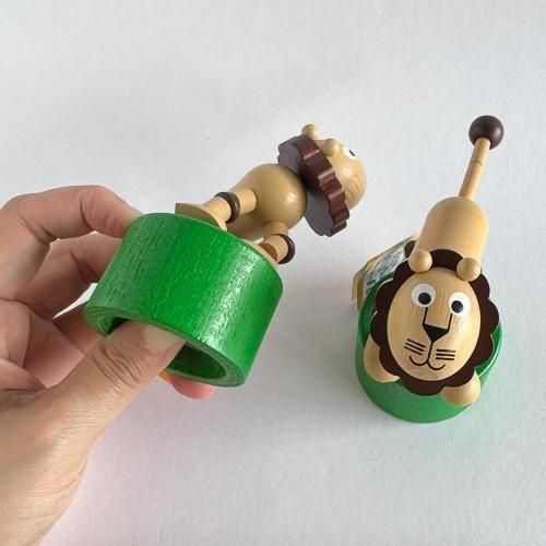 底を押すとモチーフがぐにゃりと倒れる木製プッシュトイです。
