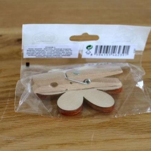 木をレザーカットして作られたお花のパーツに、マグネットがついたピンチがつけられています。