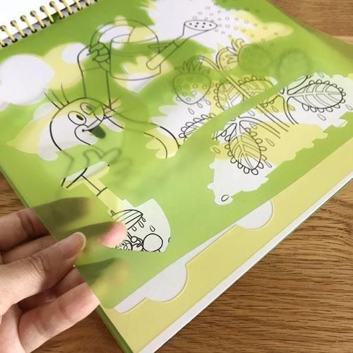 内容は、透明ステッカーシートが2ページ、シールを貼るためのステッカーシートが2ページ、テンプレートが2枚、塗り絵とお絵かきシートが24ページになっています。