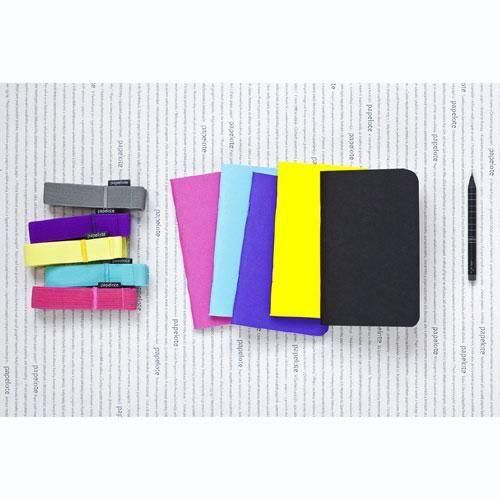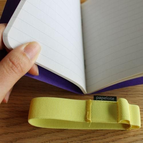 鉛筆が2本させるアモック専用サイズのゴムストラップ付き、紫のノートには黄色のストラップがセットになっています。