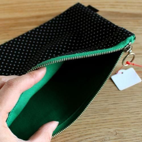 ファスナーは緑、内側も緑色、表の黒ドットとの色の組み合わせが素敵です。