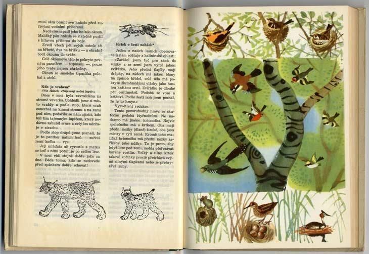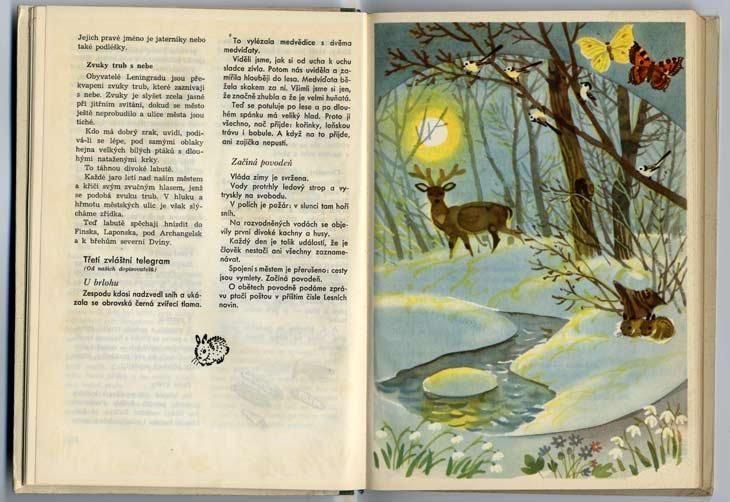 1980年にも同タイトル、同コンセプトの絵本がアントニーン・ポスピーシルにより発行されていますがこちらは1949年版。イラストなども異なります。もともとは1935年にロシアで発行された絵本のチェコ版のようです。森の新聞というタイトルで1年間、1月ごとの冊子がまとめられたという設定で構成されています。イラストも可愛らしく美しくとてもおすすめです。全190ページにページ一面を使ったカラーイラストが12点。モノクロのカットも100点以上、大量にあります。本体は経年の傷みや汚れはあるものの概ね良好。カバーは背面に汚れ、1cmほどの破れが4箇所。傷みやすいカバーなので残っているのも珍しいのですが比較的良好な方だと思います。