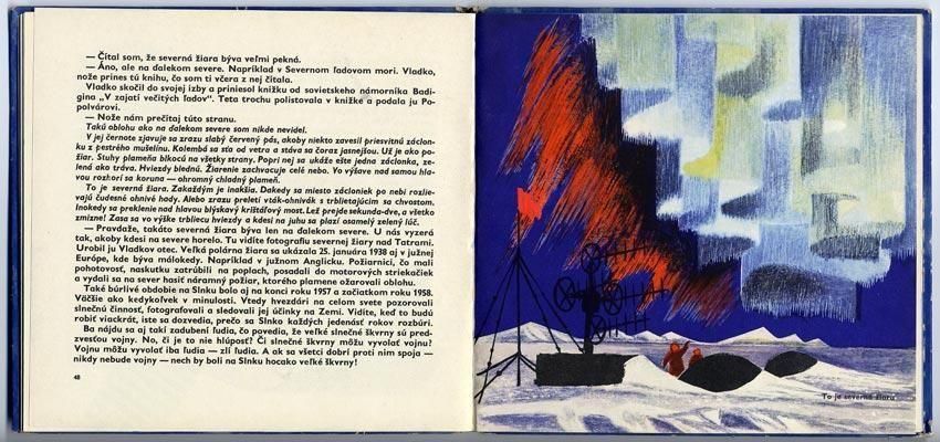 絵本のタイトルは「大きな太陽の小さな絵本」そのタイトル通り、内容は太陽が地球や人、宇宙に及ぼす影響などについて勉強するための絵本です。イラストを担当するのは他にも教材系の絵本を担当することの多いフランチシェク・シュコダ。カラフルでマットな紙質に馴染む美しい発色のイラストがとても素敵です。スロヴァキアのムラデーレター社発行で、部数も8000部と少なく珍しい一冊です。全76ページ、ほぼすべての見開きにイラスト。縁に擦れによる傷み、背表紙上下に破れによる傷み。内部は比較的良好です。