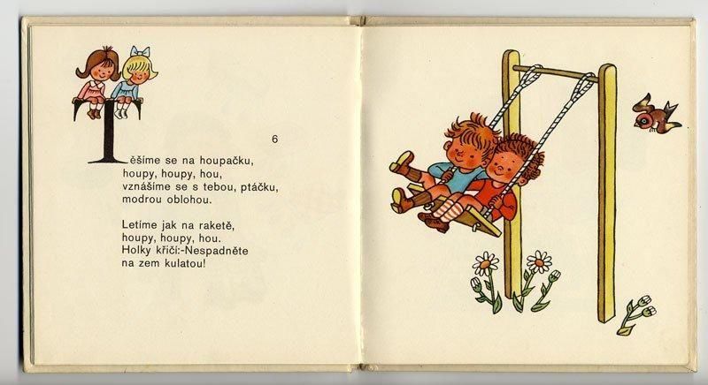日本でも翻訳され、紹介されていることの多いヘレナ・ズマトリーコヴァーの絵本です。ザラつきのある紙に素晴らしい発色で印刷されています。こどもたちのほのぼのとした楽しそうなイラストが満載です。全40ページ、左ページに詩とミニイラスト、右ページに全面イラストという構成になっています。経年の汚れ、擦れなどによる傷みはありますが比較的良好。