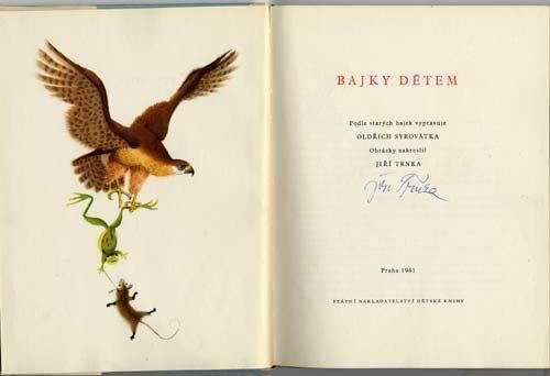 イジー・トゥルンカがイラストを担当した絵本「Bajky Detem」です。トビラのページにトゥルンカのサインがあります。チェコのイラストレーターのサイン本の中でもトゥルンカのものは、その知名度からも人気が高く、古本屋のオークションなどにもたまに出品されています。