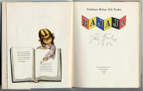 イジー・トゥルンカがイラストを担当した絵本「BAJAJA」です。トビラのページにトゥルンカのサインと1963と年代が書かれています。チェコのイラストレーターのサイン本の中でもトゥルンカのものは、その知名度からも人気が高く、古本屋のオークションなどにもたまに出品されています。
