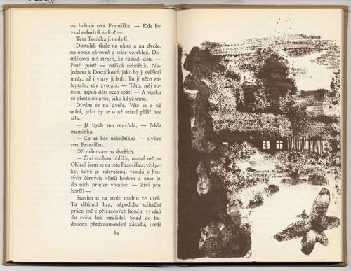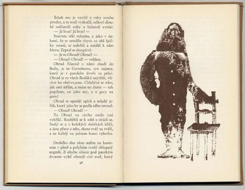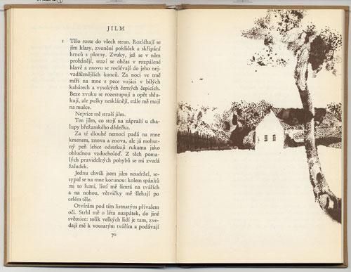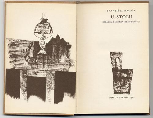 フランチシェク・フルビーンによる「テーブルの傍らで」にイジー・トゥルンカがイラストを担当した作品。晩年の作品で単色モノクロのイラストながら、デカルコマニーを多用して自らの心象を豊かに綴られた印象深い一冊です。全176ページに18点のイラスト。ページ一面を使ったイラストは7点です。発行部数は7000と少なめです。