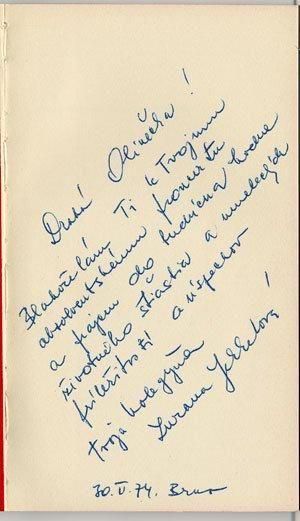 オルドジーフ・ミクラーシェクの詩や短編などを収録したペーパーバック。表紙イラストと扉のイラストをイジー・トゥルンカが手掛けています。ザラつきのある味わいのある紙質にしっかりとした美しい印刷が施されています。ちなみにタイポグラフィはフラヴサ。完成度の高い1冊です。発行部数は7000。背表紙上部に少し傷み。その他擦れなどの傷みがあります。扉にメッセージの書き込み有り。ソフトカバー。