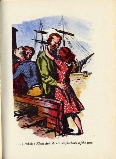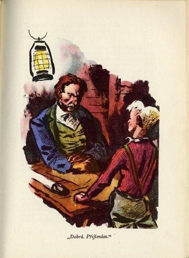 デンマークで発行された絵本のチェコ語翻訳版。イラストをイジー・トゥルンカが担当しています。1947年の第二版で初版は1939年。装丁のデザインは同じです。写実的というか、劇画的というかトゥルンカにしては珍しいタッチのイラストです。初期作品でも人物のイラストでは丸みを帯びたものが多いのですが、この作品を含め他にもいくつか似たタッチの絵本があります。全174ページに17点のイラスト。ページ一面、両面見開きを使ったカラーイラストが6点収録されています。背表紙が製本テープのような素材のため上下に2cmずつの劣化による傷み。表紙の角に少し傷み。背面見返し上部に劣化による破れが3cm。内部は経年のヤケなどはあるものの比較的状態良好です。
