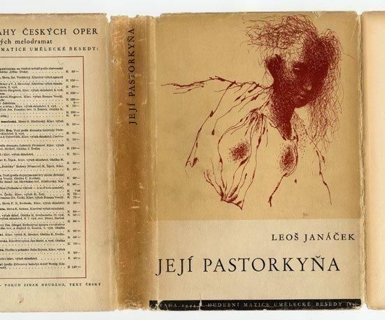 「Raduz a Mahulena」1943年と同じシリーズの本で、こちらはヤナーチェクの作品です。タイトルは「彼女の養女」ヤナーチェクによる3作目のオペラ。イェヌーファのチェコでの呼称です。全290ページで中は楽譜で構成され挿絵はありません。表紙カバーのイラストをイジー・トゥルンカが手がけています。1942年の作品でトゥルンカのダイナミックな線画が名作に花を添えています。こちらは珍しいハードカバーのタイプです。表紙カバー右上部に3cm、左下部に2cmの破れ。背表紙上下や折り返しの上下にも傷みが目立ちます。背表紙上部に1cmほど引っかき傷のような破れ。日焼け有。詳細は画像をご覧下さい。本体は裏の見返しに5mmの破れが2ヶ所その他経年の傷みはありますが比較的状態良好です。