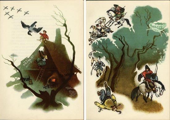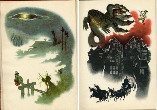 カレル・ヤロミール・エルベンが編纂したチェコとスラブの童話集にイジー・トゥルンカがイラストを担当した作品。こちらは1940年の初版です。ザラつきのある紙に鮮やかな発色でイラストが印刷されています。特に初版は2版目以降と比べても際立って厚手の紙が使用されており、まるでそこに直接描かれているかのような美しさです。