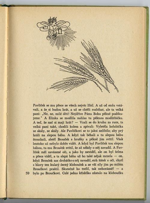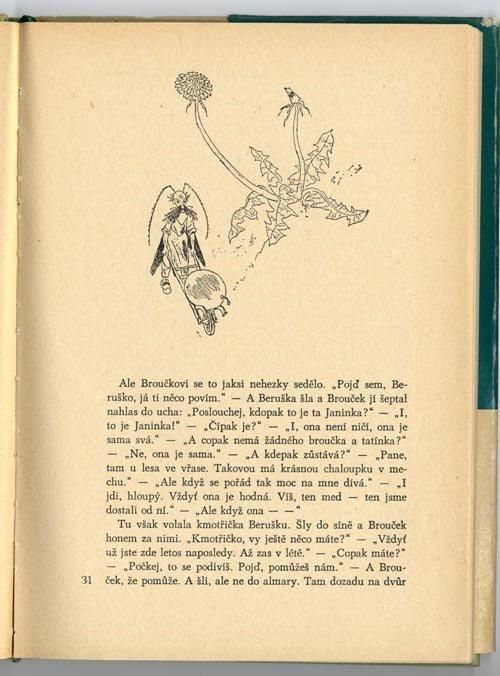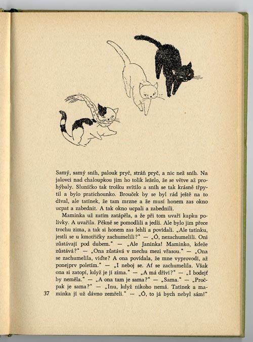 ほたるの子ミオ、ほたるっこといったタイトルで邦訳されているチェコの代表的な児童文学。イラストを担当しているのはイジー・トゥルンカ。ほたるの子が成長していく姿がトルンカのやさしいイラストで描かれています。SNDKなどからでているものとは構成が異なる1967年のBLOK版。モノクロのイラストのみが収録されています。全120ページ、大小あわせてイラストが23点。表紙カバーも本体も傷みやすいので状態の良いものはあまり見つかりません。こちらは背表紙のヤケや1cm程度のやぶれが4ヶ所ほど、鉛筆によるジグザグの書き込みも背面に少し。その他細かな破れと傷みはあるものの比較的良好。