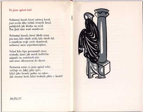 チェコで初めてのノーベル文学賞を受賞した国民的な詩人、ヤロスラフ・サイフェルトの詩集に、ヨゼフ・チャペックが挿絵を担当した作品。全34ページ。挿絵は4点と少ないですが、それよりもこの美しいブックデザインに心惹かれます。白地に黒のハッキリしたタイポグラフィでデザインされた表紙カバー。本体は相反するように黒一色の表紙で製作され、二つ折りで挟み込むように綴じられています。
