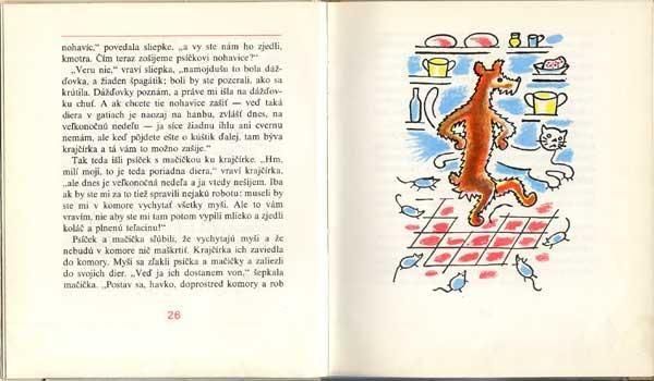 日本語でも「こいぬとこねこは愉快な仲間」というタイトルで翻訳出版されているのでお馴染みですね。今も変わらぬデザインで出版され続けるチェコ絵本の金字塔です。こちらは珍しいスロヴァキア版。正方形に近い小ぶりなサイズで全120ページにイラストはモノクロを中心に40点以上。ザラッとした紙質がヨゼフ・チャペックのイラストにマッチして、いい味を出しています。少しだけ色鉛筆の落書き跡と背表紙上下に折れシワが貫かれて1本あります。