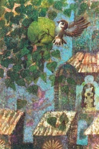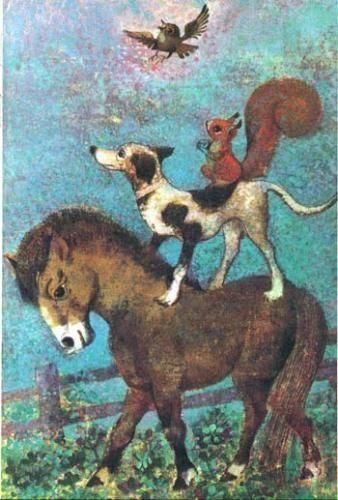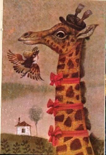 カレル・フランタはいろんなタッチでイラストを描いていますが、こういった幻想的なタッチの中でも特に人気なのが動物を描いた物。「オウムの仲間たち」みたいなタイトルですが、別に鳥ばかりが書かれているわけではなく、キリンや象、馬、リス、ネコなどいろんな動物たちが登場します。