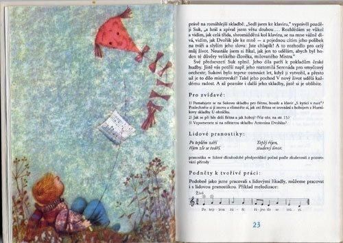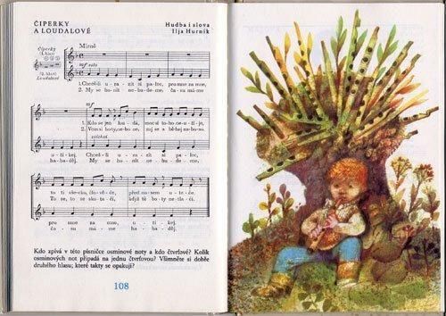 カレル・フランタによるイラストが満載の音楽の教科書です。以前に82年版を紹介しましたが、こちらは87年版。内容は同じですが紙の質が違います。こんなかわいらしい教科書で勉強が出来るなんてチェコの子どもたちはうらやましいですね。全140ページに70点以上のイラスト。ほとんどがカラーです。ページ一面を使ったカラーイラストが5点あります。教科書なので状態が悪いものが多いのですが、こちらは珍しく比較的状態良好です。