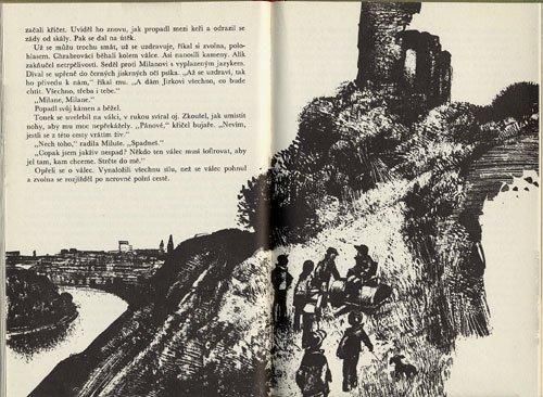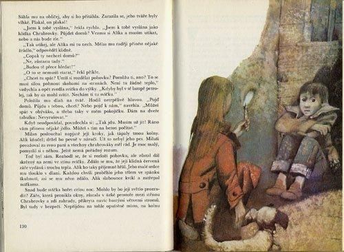 ヘレナ・シュマヘロヴァーのお話にカレル・フランタがイラストを担当した絵本です。表紙カバーには登場人物のイラストが描かれています。ステンシル調のタイポも気になりますね。味のあるザラつきのある紙に美しい印刷が施されています。全192ページに24点のイラスト。ページ一面、見開きを大きく使ったカラーイラストが3点。残りは全てモノクロのイラストです。