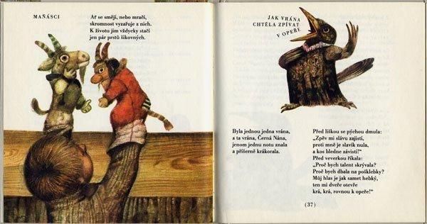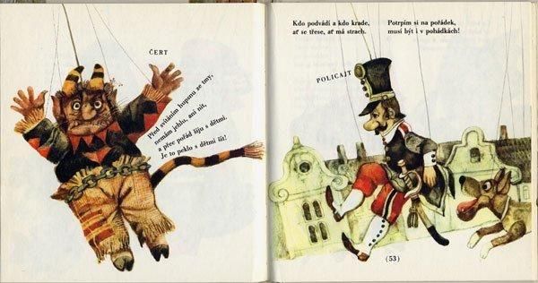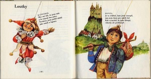 人形劇にまつわるお話が収録された絵本です。舞台芸術、装置、マリオネット、音楽、シナリオなどさまざまな要素がカレル・フランタのイラストによって彩られています。全85ページ、ほぼ全ての見開きにイラストがあります。表面のコーティングに少し気泡の浮きがありますが状態良好です。この絵本は見返しが裂けているものが多いので状態の良いものは珍しいですよ。
