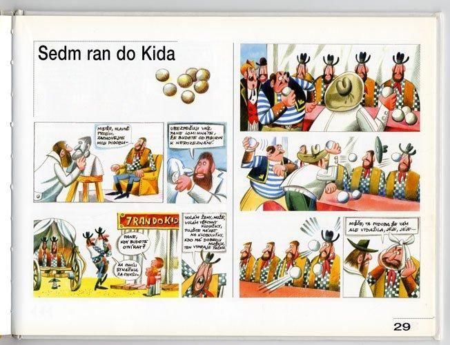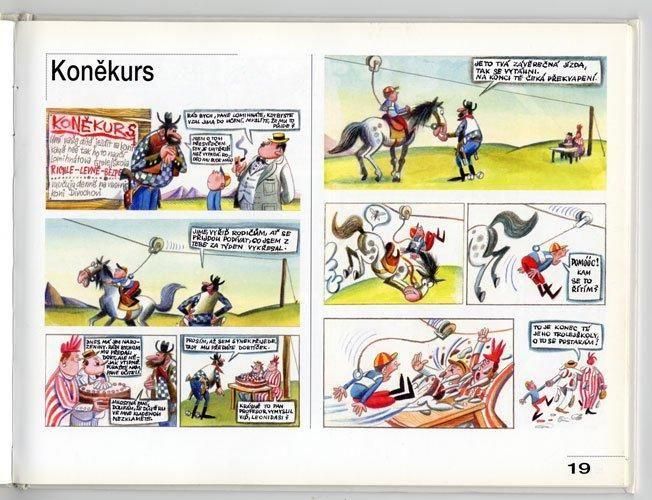 子供向けの雑誌「オフニーチェク」で連載されていた作品をまとめて一冊の絵本にした作品です。1970年にも同様のまとめ作品が出版されているのですがこちらは2000年に改めて復刻した1冊。イラストとお話を担当するのはカレル・フランタ。以前に紹介した「Clovece, nemrac se!」のようなタッチでマンガのようなコマ割で描かれた楽しい絵本です。チェコ語がわからなくても絵を追っていくとなんとなく内容がわかります。状態良好です。