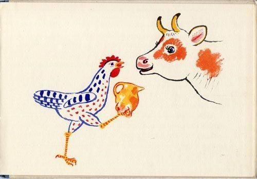 カレル・スヴォリンスキーのイラストによるニワトリの絵本。以前85年版を紹介しましたが、こちらは61年の第二版。イラストは書き直されているようで、85年の物とは少し異なります。スヴォリンスキー独特の水彩で躍動感を感じさせるイラストタッチが素敵な1冊。全22ページ、右ページに一面を使ったイラストという構成。左ページにも小さなイラストがあります。擦れなど経年の傷みは多少あるものの状態良好です。