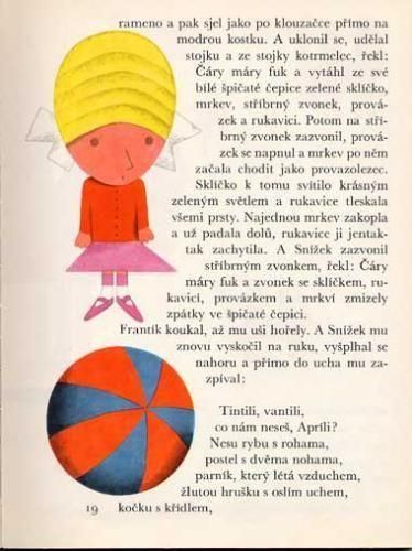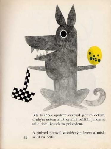 初期のクヴィエタ・パツォウスカーが好んでよく描いていた、デフォルメされた衛兵が表紙に登場しています。初期の作品らしく、こういった、まだかわいらしいタッチのイラストでニワトリやフクロウなどの動物たちが描かれています。初版は1966年版ですが、こちらは76年版。装丁デザインは同じですが表紙がビニールコーティングされているなど、紙質が少し違います。全90ページにイラストは40点ほど。