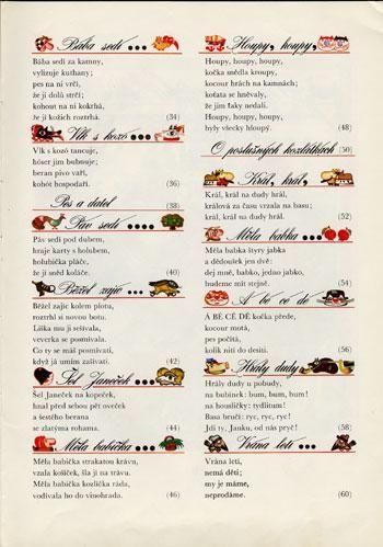 クヴィエタ・パツォウスカーの「イラストわらべうた」チェコの絵本には子供向けとは言い難い、斬新なデザインや前衛的なものが多数ありますが、こちらの絵本もその代表格のような一冊です。まるで一枚の完成されたポスターのようなアートワークで、ページが連なって行く構成になっています。ちなみに目次のページもとても可愛らしく構成されているので必見ですよ。少し厚めのザラつきのある紙に発色良く描かれたイラスト、タイポグラフィはもう絵本の粋を超えた一つの芸術作品のようです。グラフィック好きの方にはぜひ手にとって見てもらいたい一冊です。