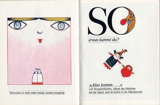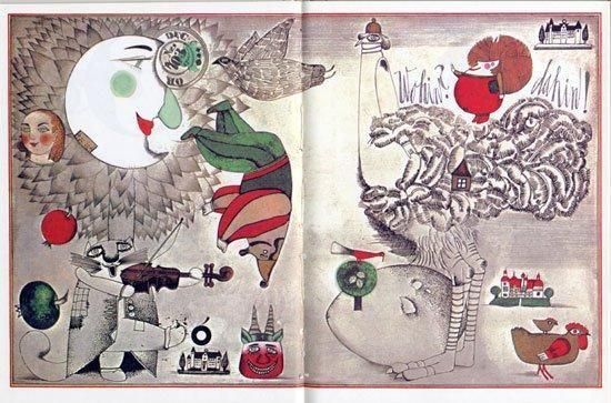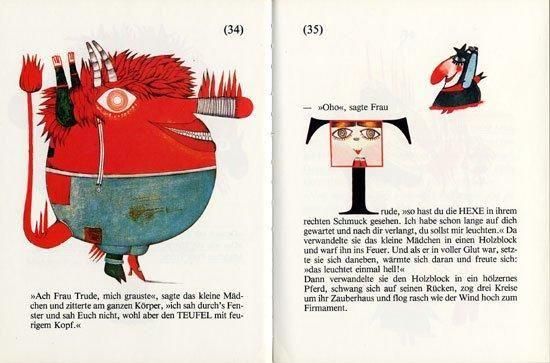 グリム童話にクヴィエタ・パツォウスカーがイラストを担当した絵本です。チェコ語版は何度も紹介していますが、こちらはドイツ語版。チェコ語版出版後すぐの2年後に翻訳出版されています。装丁デザインも黒枠が省かれたスッキリとしたデザインで、こちらも味わいがありますね。赤と緑が効果的に使われた、彼女独特のタッチで描かれているので、何の話なのかさっぱりわかりませんがさまざまなアートワークが収録されているためファンにとっては最高の一冊です。