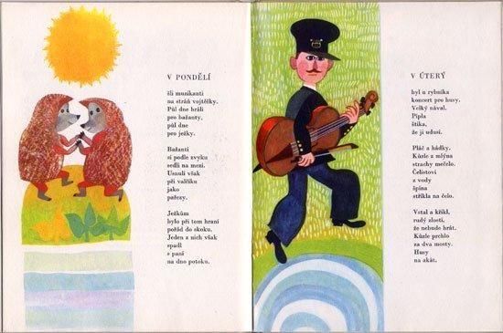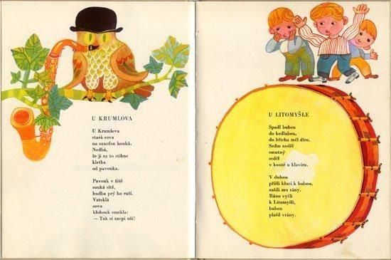 数え歌や童話など、3部構成で進む音楽にまつわる内容の絵本です。イラストを担当するのはミロスラフ・ヤーグル。彼の作品の中でも6000部と発行部数が少なく、珍しい作品です。色鮮やかでかわいらしく、コミカルなイラストが多くておススメの一冊です。全42ページ、すべての見開きにイラストがあります。ところどころ擦れ、汚れ、図書館の蔵書印など経年の傷みが多少目立ちますがひどい破れなどはありません。比較的状態良好です。