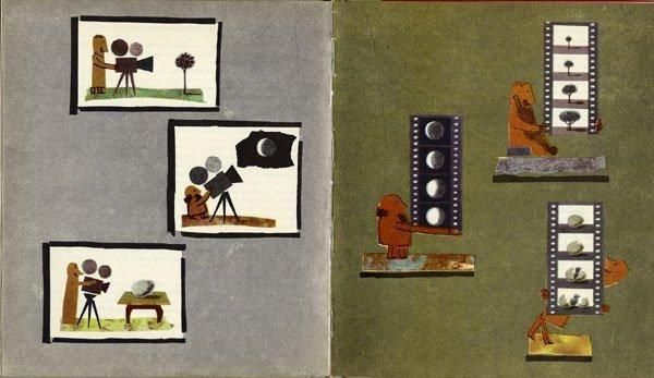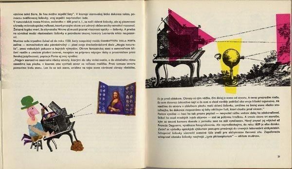 映画やアニメーションの歴史、技術などを紹介した学習絵本です。スロヴァキアのムラデー・レター社発行です。何と言っても注目すべきはそのイラストレーターです。2匹のクマでおなじみ「ぼくらと遊ぼう」の美術監督を務めたミロスラフ・シュチェパーネク。そして監督のブジェチスラフ・ポヤルがイラストを担当しています。シュチェパーネクの絵本は今までにも少し紹介したことがあるのですが、ポヤルも関わっているというものは初めて見ました。全200ページに大小さまざま100点ほどのイラストや写真。コラージュなども頻繁に使われていて、面白いアートワークが堪能できます。トゥルンカが所長を務めたアニメーションスタジオのキャラクター「Tシャツ3兄弟」もさりげなく登場しています。初版、発行部数は8500とかなり少なめです。
