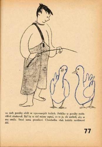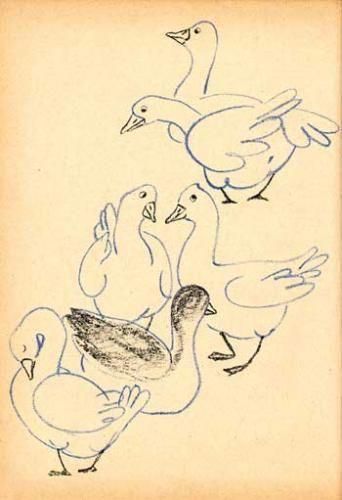 流し目のアヒルにやられた!と言う方に手に入れて欲しい一冊です。様々な絵本の編集を担当するオルガ・パヴァロヴァーによるイラストの絵本です。全107ページに54点のイラストを収録。全て色鉛筆で書いたようなタッチの線画イラストですが。とにかくかわいいイラストが多いです。見返しのイラストも最高です。1958年の作品と古いこともあり、日焼けやシミなどはありますが比較的状態良好です。