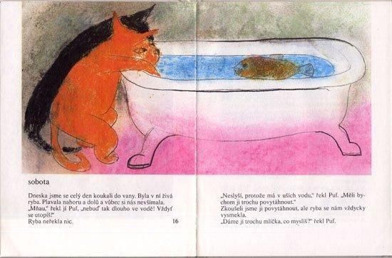 84年にブラチスラヴァのムラデーレター社から発売された絵本のチェコ語版。2匹の猫プフとムフのお話。この絵本は何人かのイラストレーターにより出版されていますが、中でも一番素晴らしいのがオタ・ヤネチェクのバージョンです。クレヨンのようなタッチで描かれたイラストや、油彩画、コラージュなどヤネチェクの魅力が詰まった一冊です。全64ページ、背表紙に日焼けによる退色。その他擦れなど経年の傷みがあります、またイラストとは関係のないところで少し汚れのあるページも有りますが比較的状態良好です。