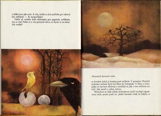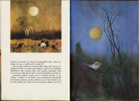 「鳥のうたにみみをすませば」と言うタイトルで翻訳され、日本でも出版されていた絵本のチェコ語オリジナル版です。テキストを担当するのはチェコの有名な詩人、フランチシェク・ネピル。イラストはオタ・ヤネチェクによるものです。物語にオタ・ヤネチェクが挿絵を担当した、と言うのではなくヤネチェクの美しいドローイングにあわせて、ネピルが詩をつけるという、普通の絵本とは違った製作方法がとられているため、まるでヤネチェクの画集かのようにイラストを楽しむことができます。全66ページ、ほぼ全ての見開きにヤネチェクの幻想的なイラストが描かれています。表紙の角に少し擦れによる傷み。その他経年の傷みは多少あるものの比較的状態良好です。