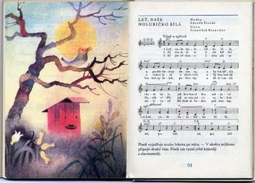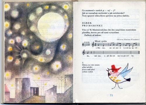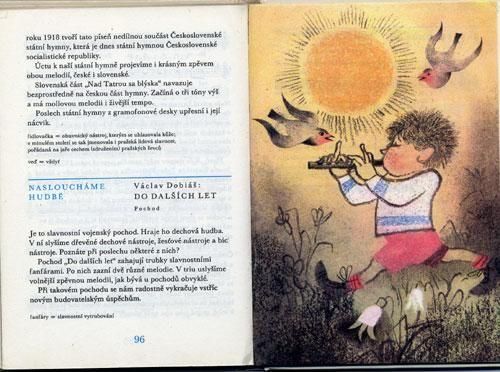 オタ・ヤネチェクがイラストを手がけた音楽の教本。小学校3年背向けで、童謡や楽器などの紹介がヤネチェクの幻想的なイラストで描かれています。ザラつきのある紙質に発色良く印刷が施されています。全126ページにページ一面を使ったイラストは7点、小さなカットやページの半分ほどを使ったイラストが2、3ページに一度ぐらいの割合で描かれています。こんなテキストで勉強できるなんて本当にうらやましいですね。イラストにはあまり関係の無いところで、教科書特有の鉛筆やボールペンによる書き込みが少しあります。1ページ3mm程の破れがあります。