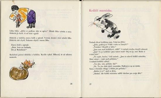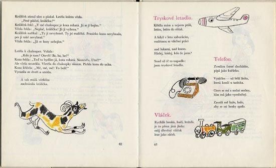 ヤネチェクがイラストを担当する子供のための短編集です。1975年版です。全60ページ、ほぼすべてのページにイラストがあります。ヤネチェク独特のボヤっとした感じでもなく、細いモノクロの線画でもなく「SLABIKAR ABC」と同じような色鉛筆で描かれたようなイラストタッチです。経年の傷みや汚れは多少あるものの比較的状態良好です。