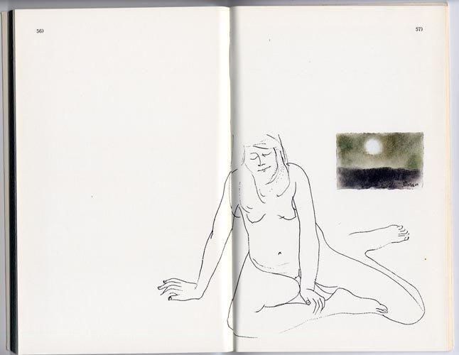 イラストはモノクロの線画とカラーイラストがあり、線画では裸婦が描かれています。しなやかな線で描かれるヌード絵がとても素敵です。カラーイラストは太陽のある風景を描かれた油絵が収録されています。テキストとのバランスや構成も美しい一冊です。そして何よりこちらの書籍は発行部数が少なく、初版800部限定です。全70ページ、カラーイラストは大小あわせて8点。モノクロのカットも8点。背表紙に日焼けによる変色があります。ソフトカバーで表紙カバーに少しスレなどによる傷みがあります。内部は状態良好。