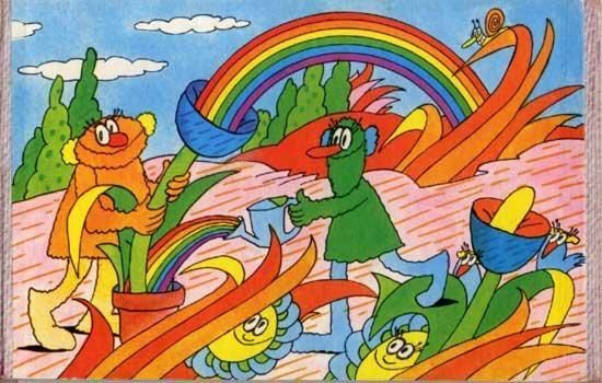 鮮やかな色使いで、眺めているだけでも楽しくなる、スタニスラフ・ホリーのイラストによる絵本。以前「Prochazky pana Pipa」を紹介しましたが、こちらは知っている人は知っているキャラクター、ユーとヘレ。「ユーとヘレのにちようび」と言うタイトルの絵本です。テキストは無く、鮮やかなイラストのみで構成された蛇腹式のボードブックです。12ページ。広げると全部のイラストが繋がっているので楽しいですよ。