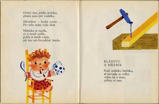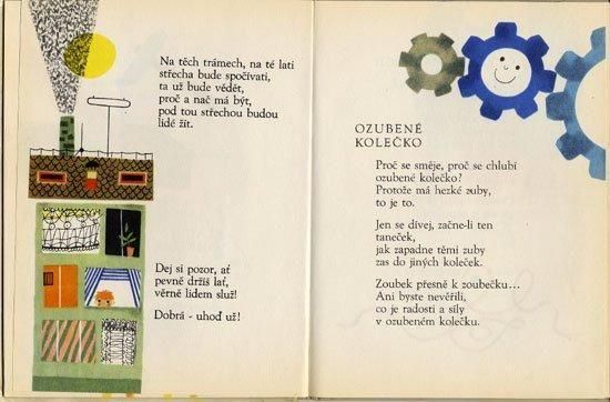 ヤン・チャレックの詩にヴェラ・ファルトヴァーがイラストを担当した絵本。ファルトヴァーといえば「Olympiada Kocoura Vavrince」のようなはっきりとした線で描かれるキャラクターの個性が前面に押し出された作品が多いのですが、初期作品と言うこともあってかなりイラストの雰囲気が違います。優しい色使いと柔らかなタッチにコラージュが組み合わされ、とても完成度の高いアートワークに仕上がっています。