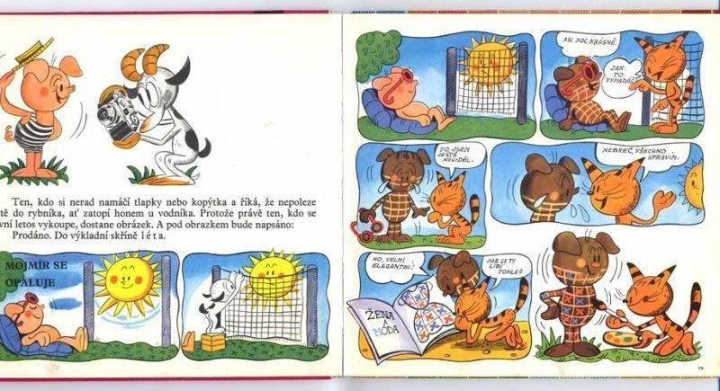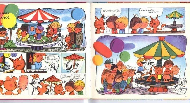 表紙に描かれている猫が主人公のお話で、中のイラストはほとんどが漫画のようにコマ割りされて描かれているため、文字が読めなくても何となく内容がわかります。イラストを担当するのはヴェラ・ファルトヴァー。コマ割りだけではなく、描かれているキャラクターたちもかわいらしく個性的です。69年の作品で、以前同じシリーズの71年の別のお話を紹介しています。厚手でザラッとした紙に発色よくイラストが描かれています。全52ページ、ほぼ全ての見開きにイラストがあります。
